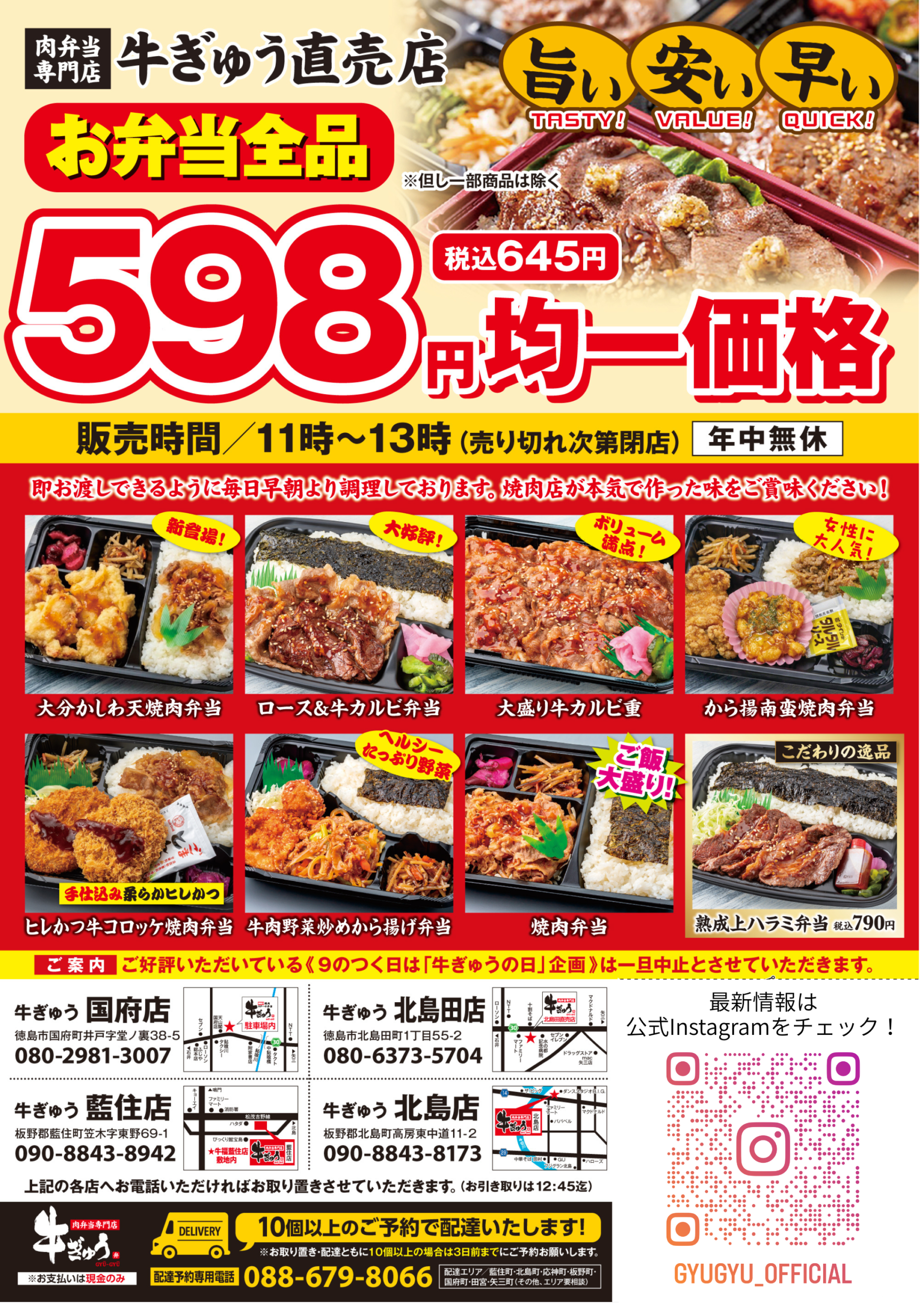 最新情報 店長おすすめロース&牛カルビ弁当 新登場 2026.02.262026.02.26 詳しくはこちら 北島店・藍住店の2店舗で、お弁当全品が均一価格になるキャンペーンを開催します。 2026.01.152026.01.14 詳しくはこちら 牛ぎゅう「旨い」のこだわり 厳選素材のお肉を秘伝の手作りタレで揉みこんで焼きあげた焼肉は炊き立てごはん徳島産「あわみのり」との相性抜群です。 Previous image Next image 1)厳選素材 食感とジューシーさを楽しんでいただく為、ハラミ、牛タンなどチルド肉(冷蔵)を取り扱っています。 2)店内仕込み 長年焼肉店で修業した肉職人が毎日必要な数だけ手切りで丹精込めて仕込んでいます。 3)秘伝のタレ 最高に美味しい焼肉弁当を追い求め、何度も何度も試行錯誤してたどり着いた秘伝のタレ。無添加の安心安全な商品をお届けしたいという想いからタレに手間ひまを惜しまず、選りすぐりの食材を16種類ブレンドして、すりおろしにこだわり作りあげました。肉の美味しさを最大限に引き出す牛ぎゅう秘伝のタレと焼肉弁当をご賞味下さい。 *生ダレの為、タレだけの販売は取り扱っておりません。 弁当メニュー 店舗情報 国府店 住所 徳島県徳島市国府町井戸字堂ノ裏38-5 電話番号 080-2981-3007 営業時間 11:00~13:00 ※コンテナ弁当のみの販売 北島田店 住所 〒770-0051徳島県徳島市北島田町1丁目55-2 電話番号 080-6373-5704 営業時間 11:00 ~ 13:00 ※売切次第終了 藍住店 住所 〒771-1261徳島県板野郡藍住町笠木東野63-1 営業時間 11:00 ~ 13:00 ※売切次第終了 住所 〒779-3222徳島県名西郡石井町高川原天神670-1 営業時間 11:00 ~ 13:00 ※売切次第終了 北島店 住所 〒771-0206徳島県板野郡北島町高房東中道11-2 電話 090-8843-8173 営業時間 11:00 ~ 13:00 ※売切次第終了